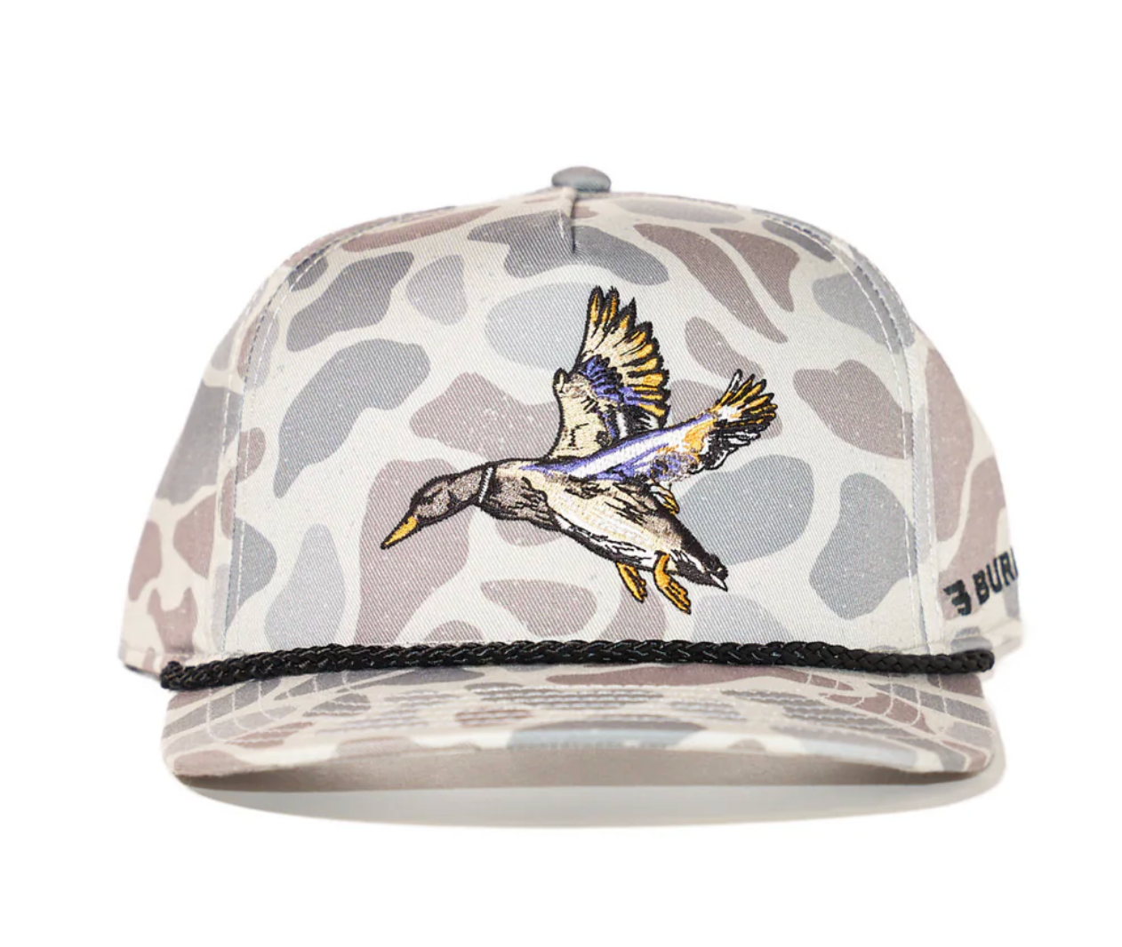 Blend in while standing out with the Diving Mallard Cap in our signature Classic Deer Camo. Featuring a dynamic embroidered mallard diving in mid-flight, this cap is a nod to the wild and a staple for any outdoorsman. The camo pattern offers a rugged, vintage-inspired look, while the structured fit and rope detail add a timeless feel. Whether you're chasing birds or just kicking back, this cap brings field-ready style wherever you go.