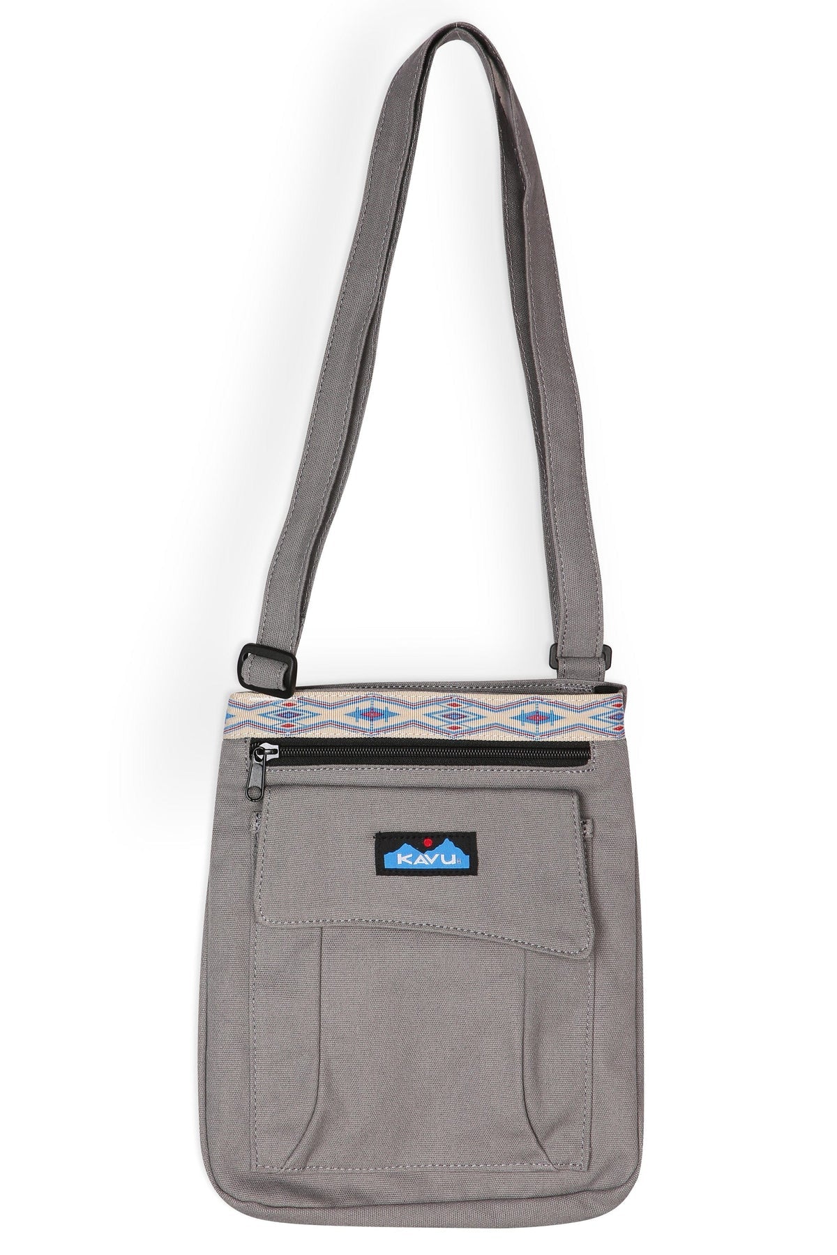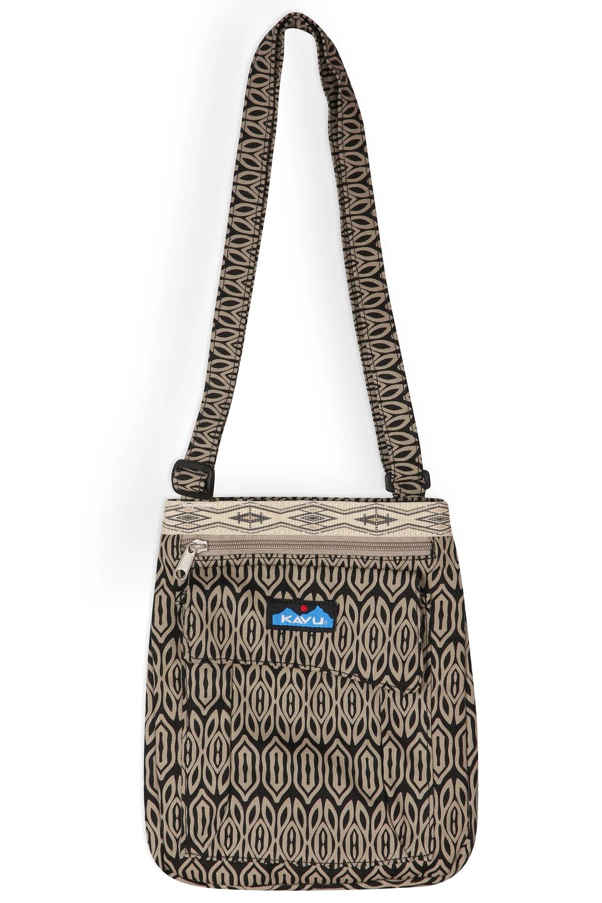 Cross body bag with adjustable shoulder strap, main compartment with snap closure, front zip and patch pockets, back flat pocket, internal organizational pockets.